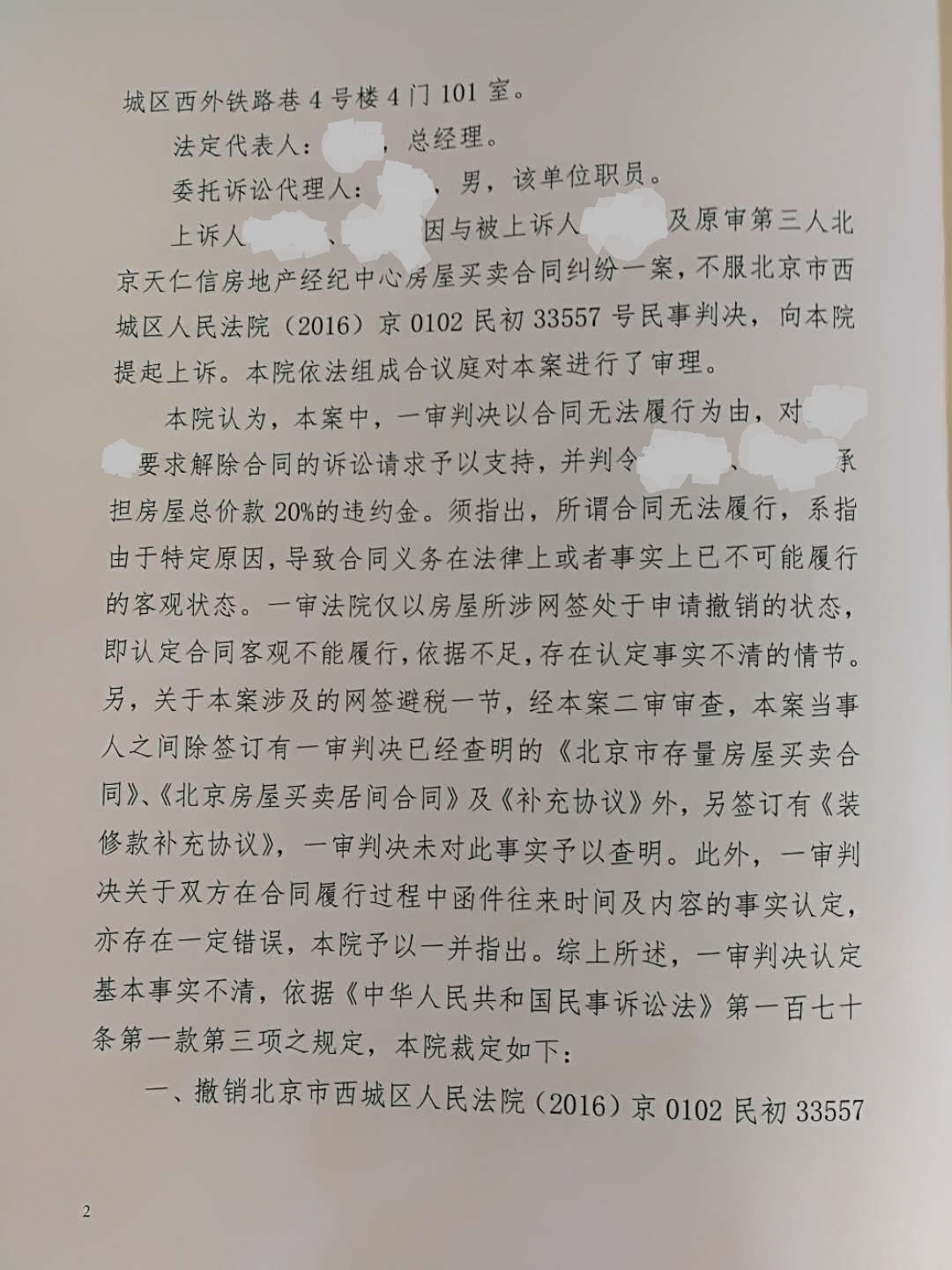 原被告双方约定以436万进行房屋买卖,原告为卖方,被告为买方,2016年5月14日双方签订合同,定金为10万元,首付款为136万元,首付款约定要在2016年7月30日前支付,剩余通过银行贷款,2016年8月30日前办理房屋过户登记手续。2016年7月19日双方办理了第一次网签,网签上房屋的价格是416万,8月3日中介通过他人撤销了该网签,至于谁申请撤销网签谁也不承认。原被告原本商量第一次以高的价格网签,便于被告向银行申请贷款,第二次再以低的价格网签,便于避税。因网签为办,批贷未下来,被告于2016年9月19日向原告支付了首付款,但双方就过户及房屋过户始终没有达成一致,最终原告将被告诉至法院,要求解除合同,并要求被告承担违约责任。一审支持了原告的诉讼请求,被告于是找到北京市东元律师事务所合伙人律师李松,作为自己二审的委托代理人,李松律师认为网签处于撤销状态并不能表明合同已经失去继续履行下去的基础,同时,本案中到底由谁的原因造成合同无法继续履行事实不清,最终二审法院采纳了李松律师的代理意见,裁定撤销原判,发回重审。