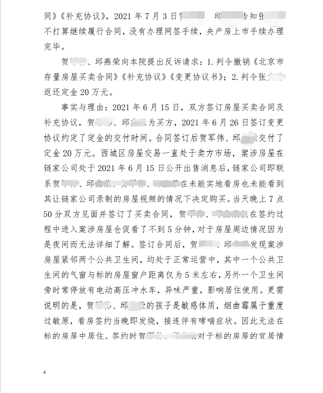 在此期间,被告方提出反诉:由于周边环境问题(距离房屋5米距离有公共厕所),以及家人特殊体质,主张出卖人未告知实情,基于重大误解而解除合同。