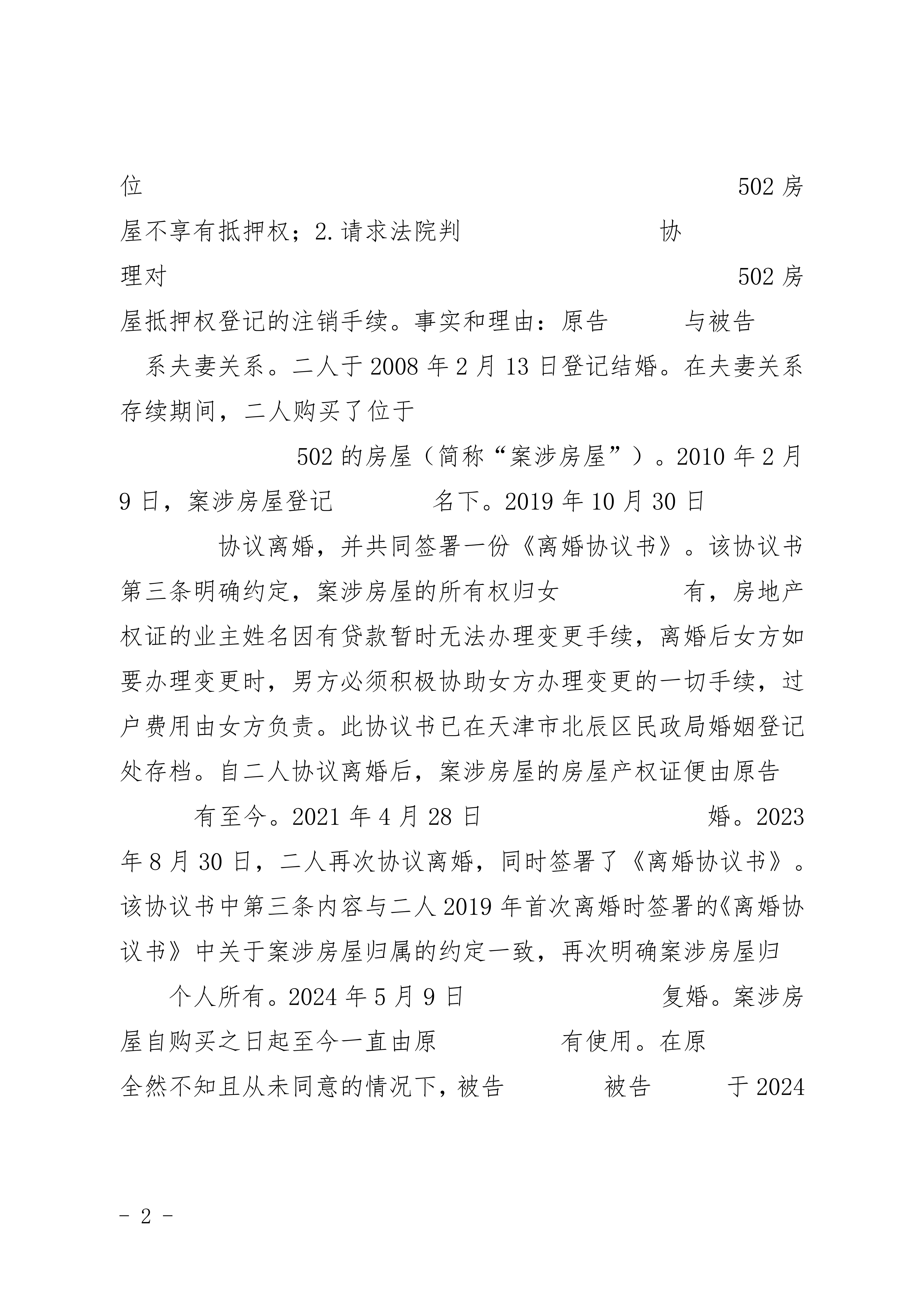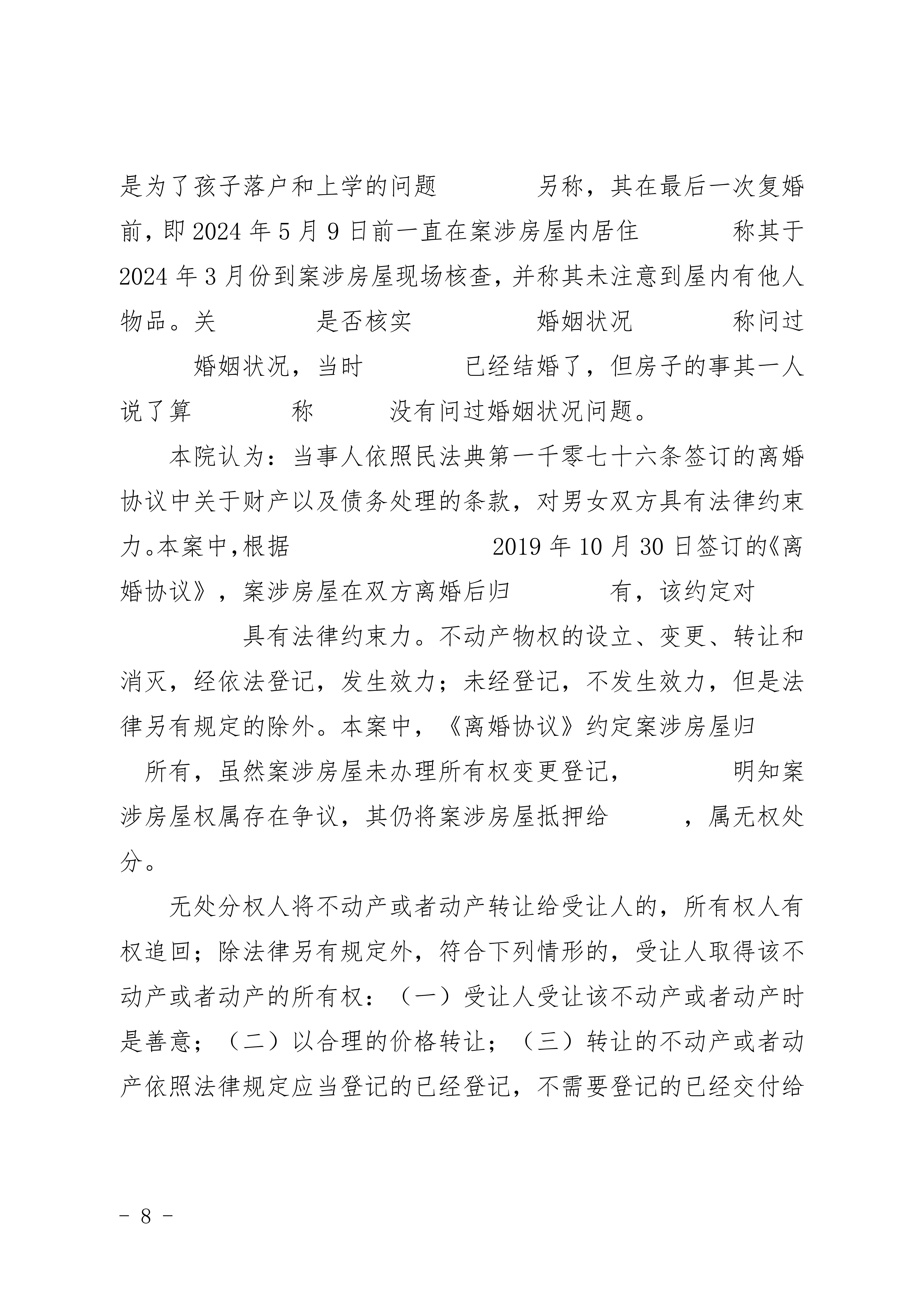 2008 年,白女士与周先生结婚后共同在北京购置一套房产,登记在周先生名下。2019 年二人离婚,备案离婚协议明确房产归白女士所有,因房贷未结清暂未过户,男方需配合后续过户;2021 年二人为孩子复婚,2023 年因投资理念分歧再次离婚,第二次离婚协议仍约定房产归白女士,2024 年二人再次复婚。