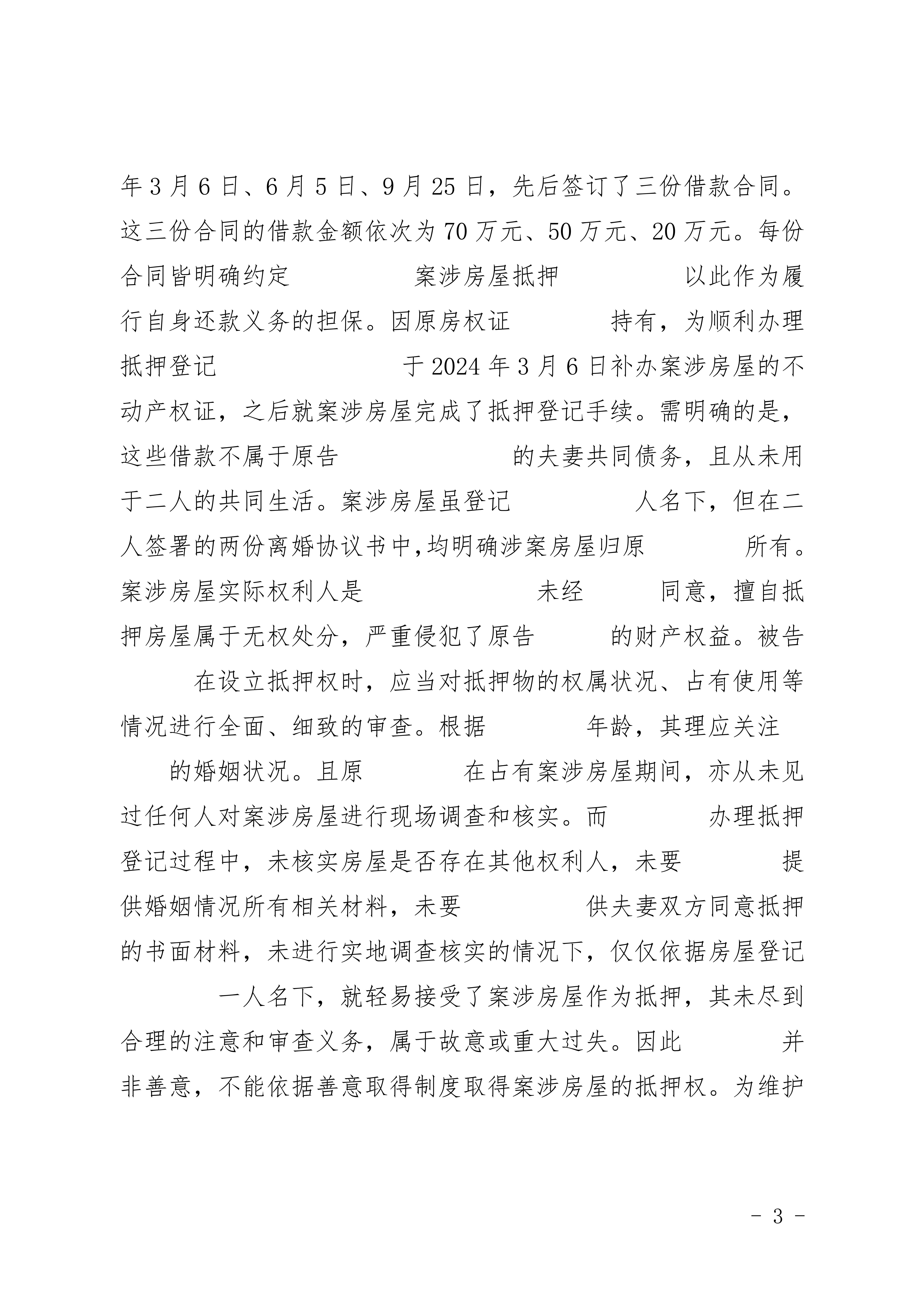 结合本案事实:高立峰自认周先生已明确告知其已婚有配偶,且周先生声称自己能做主、可代表配偶同意抵押。这意味着高立峰既明知周先生已婚,也知晓房屋抵押需取得配偶同意,在其完全有条件主动与白女士核实意见的情况下,却未做任何审查,仅依据房产证上的登记信息便办理了抵押登记,该行为已构成重大过失,不属于 “善意第三人”,依法不能取得房屋抵押权。
